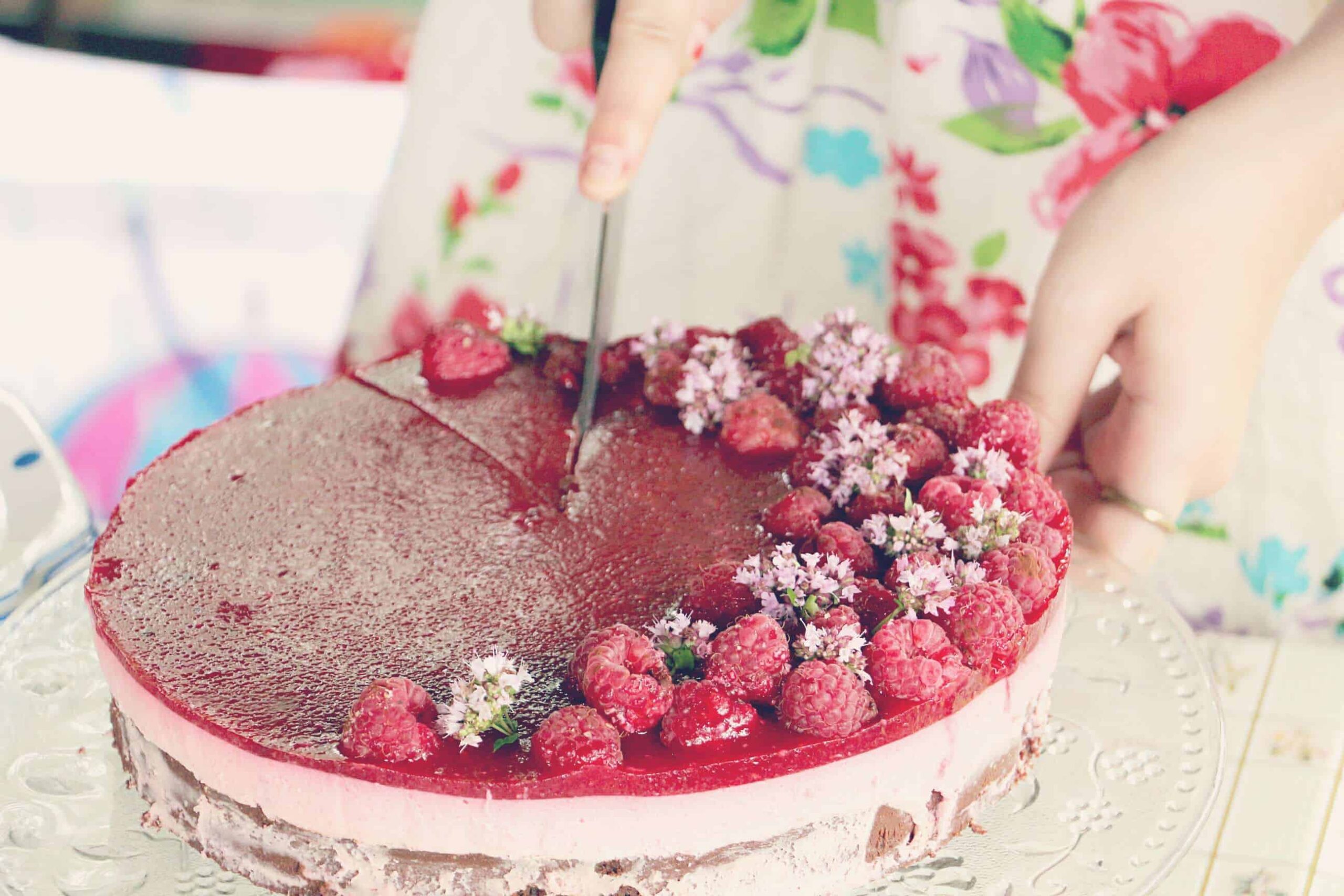 Ozdobte hezkými čerstvými malinami, které zbyly (ty ošklivější strčte rovnou do pusy), a dejte aspoň na další dvě hodiny tuhnout.